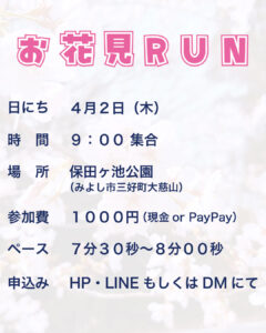 保田ヶ池(みよし)から三好丘桜公園(みよし)へ向かいます。帰りは東郷方面を回って戻ってきます!総距離は約12kmほどです♪ペースはキロ8分くらいで行います✨ゴールの少し手前に「omusubi +cafe OMU」というおにぎりが美味しいお店があるので、そちらでおにぎりを買ってゴール後にみんなで食べてから解散としようと思います🍙