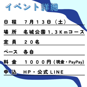7月13日(土)名城公園の1.3kmコースでロング走を行います!暑い時期、一人でロング走を行うのは体力的にもメンタル的にもきついですよね、、、。少し早起きして、仲間と一緒に夏のトレーニングを乗り切りましょう👍