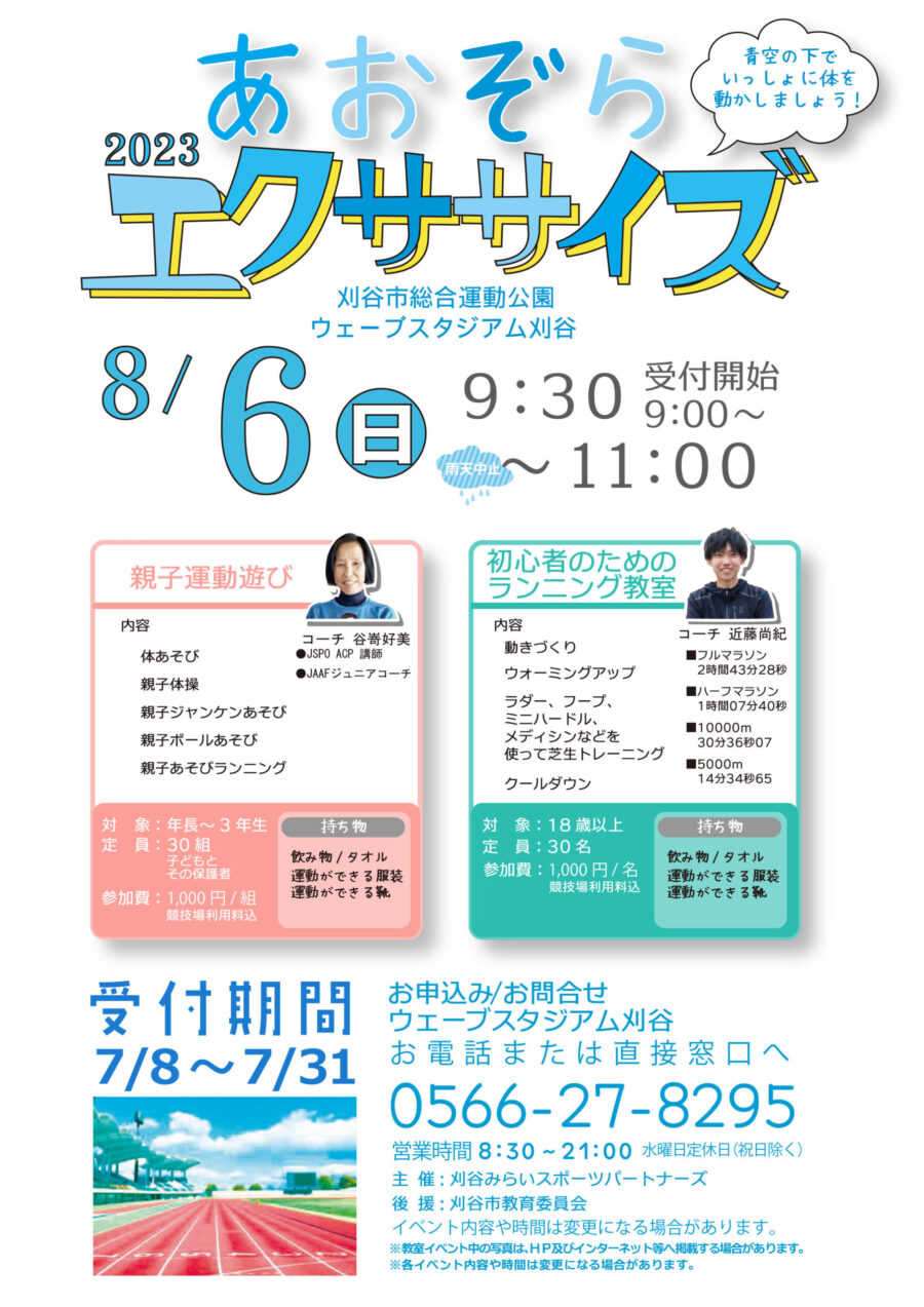 8月6日(日)に刈谷市のウェーブスタジアム刈谷で開催される「あおぞらエクササイズ」にて、初心者のためのランニング教室を開催します✨